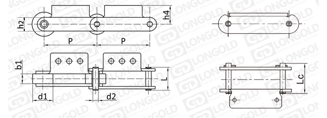 此種輸送鏈?zhǔn)怯呻p節(jié)距鏈條衍生而來(lái)的,鏈條節(jié)距為非常用規(guī)格,通過(guò)裝備標(biāo)準(zhǔn)附件或非標(biāo)附件使鏈條滿足特定的工作需求。