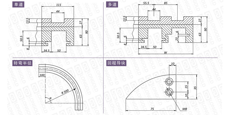 在選擇軌道時,需要考慮安裝尺寸、材質(zhì)性質(zhì)、轉(zhuǎn)彎角度等因素,如有需要,請咨詢隆德技術(shù)人員。