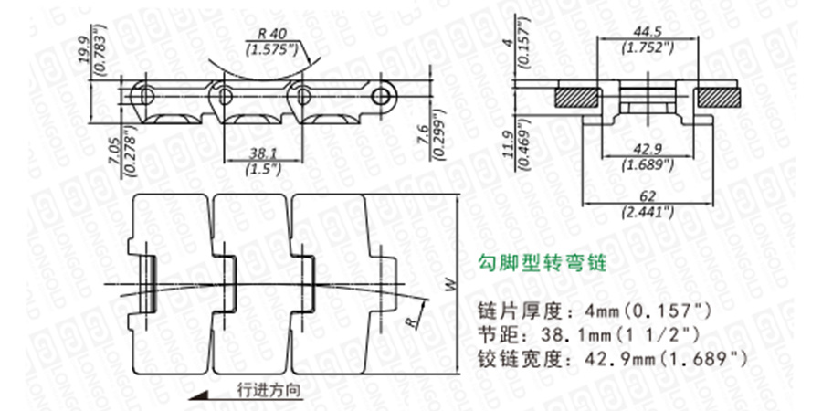 上圖為LD880T系列轉(zhuǎn)彎鏈的結(jié)構(gòu)圖,圖紙已標(biāo)明本體尺寸。