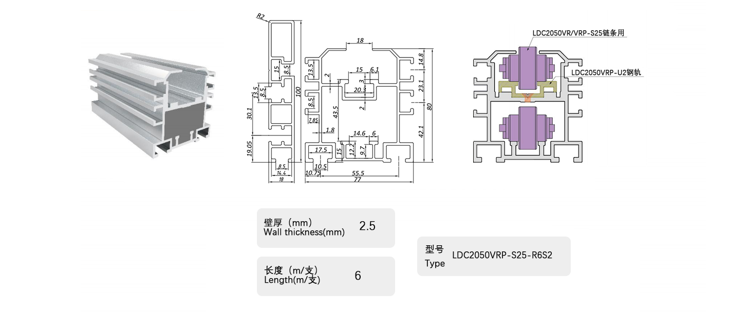 倍速鏈條用鋁制框架,用于滾子部采用工程塑料的倍速鏈條,包括帶蓋罩的倍速鏈條。在鋁制框架的輸送側(cè)小直徑滾子部安裝有鋼軌,可用于所有倍速鏈條。