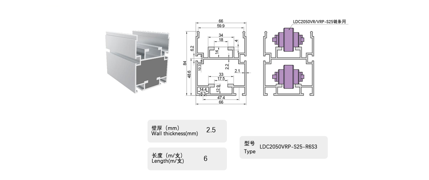 倍速鏈條用鋁制框架,用于滾子部采用工程塑料的倍速鏈條,包括帶蓋罩的倍速鏈條。在鋁制框架的輸送側(cè)小直徑滾子部安裝有鋼軌,可用于所有倍速鏈條。
