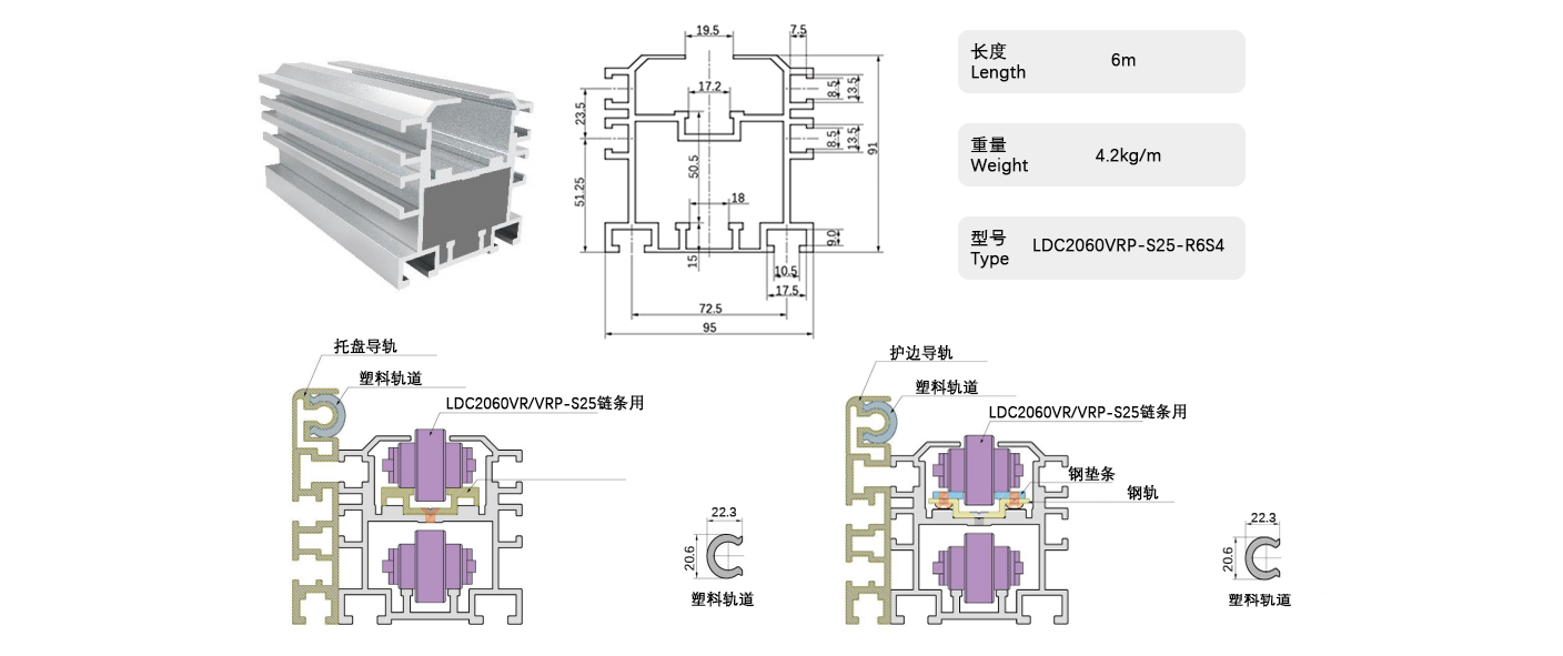 倍速鏈條用鋁制框架,用于滾子部采用工程塑料的倍速鏈條,包括帶蓋罩的倍速鏈條。在鋁制框架的輸送側(cè)小直徑滾子部安裝有鋼軌,可用于所有倍速鏈條。