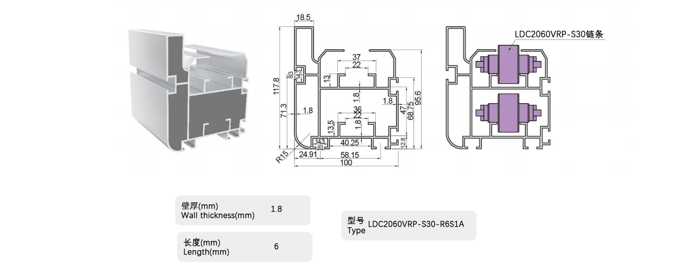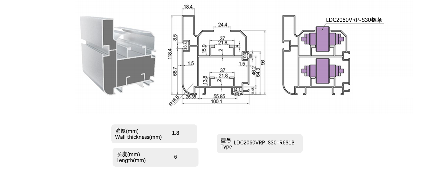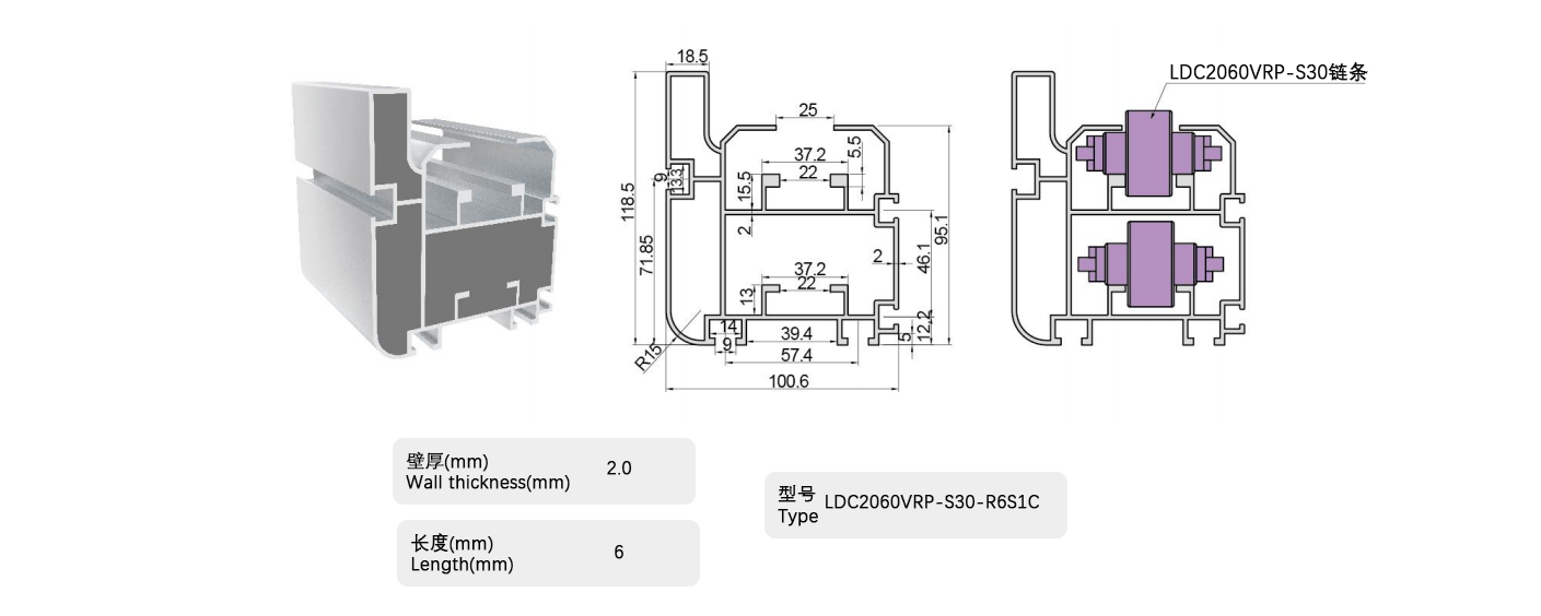 倍速鏈條用鋁制框架,用于滾子部采用工程塑料的倍速鏈條,包括帶蓋罩的倍速鏈條。在鋁制框架的輸送側(cè)小直徑滾子部安裝有鋼軌,可用于所有倍速鏈條。