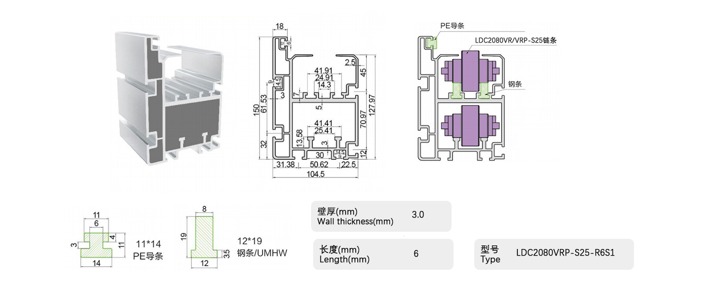 倍速鏈條用鋁制框架,用于滾子部采用工程塑料的倍速鏈條,包括帶蓋罩的倍速鏈條。在鋁制框架的輸送側(cè)小直徑滾子部安裝有鋼軌,可用于所有倍速鏈條。