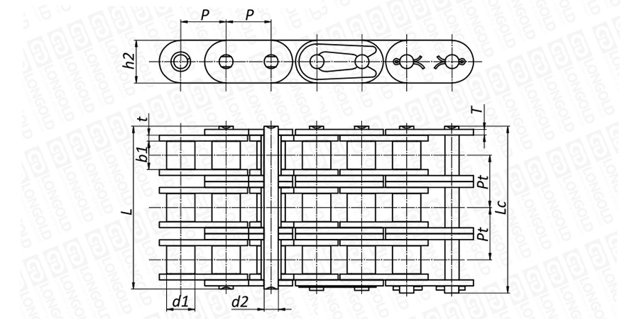 上圖為三排不銹鋼短節(jié)距B系列直板滾子鏈本體的結(jié)構(gòu)圖。