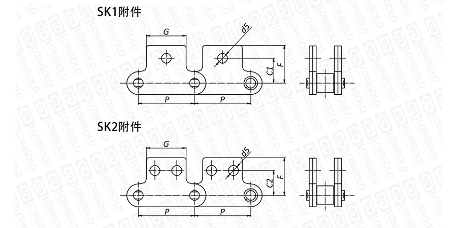 鏈條兩側(cè)鏈板向上延伸,延伸的附板成為附件,附板上帶1個(gè)或2個(gè)螺孔,附件表示為:SK1、SK2。