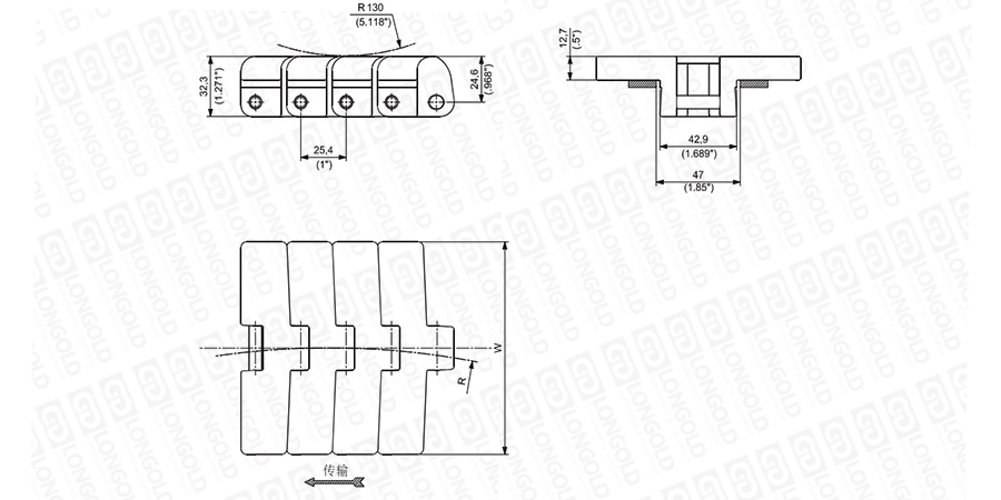 上圖為1"節(jié)距轉(zhuǎn)彎鏈板 793L系列的結(jié)構(gòu)圖,圖紙已標(biāo)明本體尺寸。