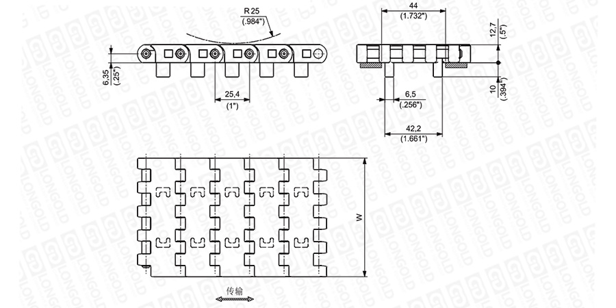 上圖為1 1/4"節(jié)距重載轉(zhuǎn)彎網(wǎng)帶 2556 HTB系列,圖紙中已標(biāo)明部分尺寸。