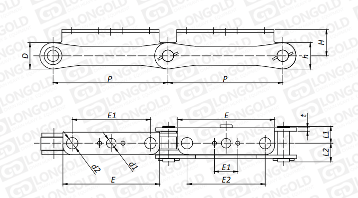 鏈條每節(jié)都附帶內(nèi)彎附件,附件帶三個(gè)孔。