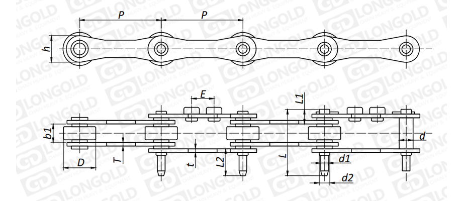 鏈板為特殊鏈板,帶GNA2附件,即一側(cè)鏈板上帶有兩個孔的中孔附件;同時鏈條帶錐型延長銷。