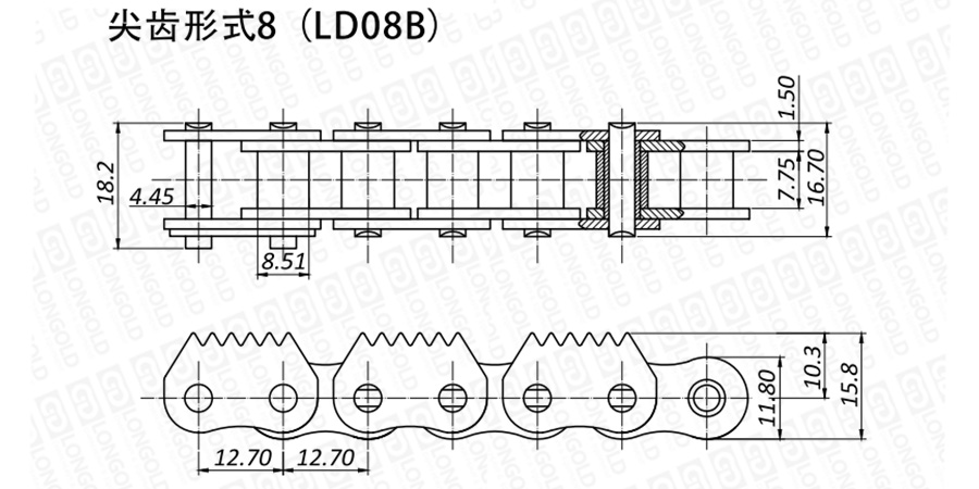 上圖為不銹鋼尖齒鏈VIII的結(jié)構(gòu)圖。