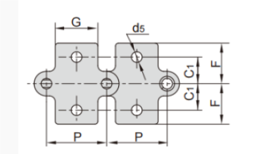 上圖為S滾子鏈雙倍節(jié)距鏈帶附件圖,R滾子型的附件尺寸也與其相同。