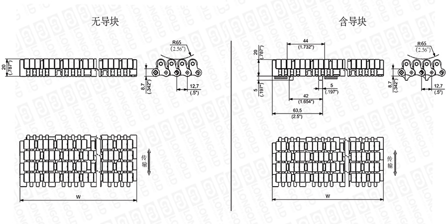 上圖為1/2"節(jié)距網(wǎng)帶與鏈板 LBP 610系列的結(jié)構(gòu)圖,圖紙中已標(biāo)明部分尺寸。