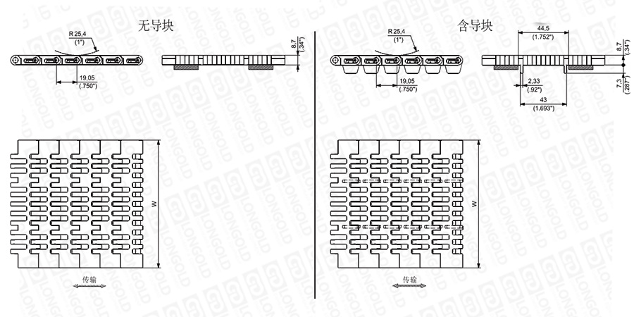 網(wǎng)帶可與磁性或勾腳型鏈板782或783系列并排使用,實現(xiàn)產(chǎn)品在直行與轉彎輸送中的順暢過渡。