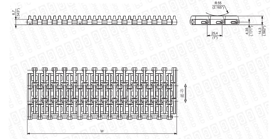 上圖為1"節(jié)距輕載網(wǎng)帶與鏈板 RR 1500系列的結(jié)構(gòu)圖,圖紙中已標(biāo)明部分尺寸。