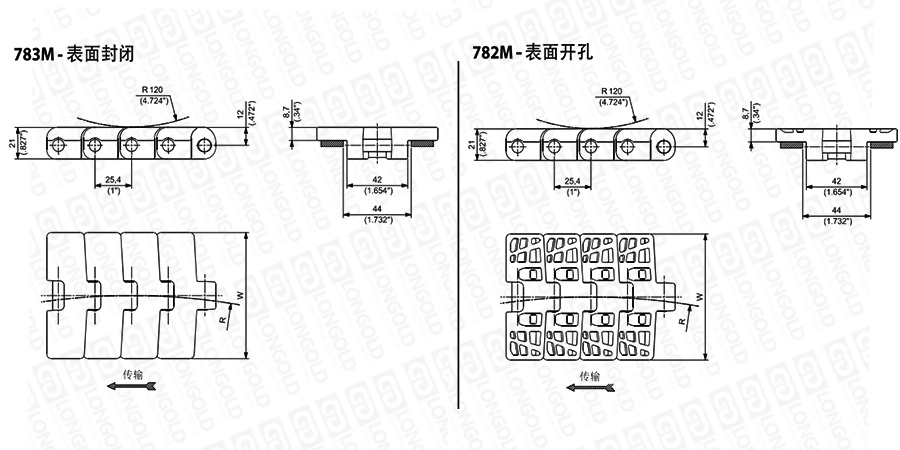 勾腳型轉(zhuǎn)彎鏈板783T系列與Fitetop塑料鏈板880T,879T系列及Flitetop金屬鏈板881T與981T系列,使用相同的轉(zhuǎn)彎軌道。