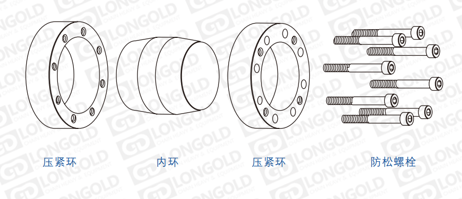 兩個帶內(nèi)錐?的壓緊環(huán)在壓緊螺釘?shù)淖?下,擠壓帶有外錐面的內(nèi)環(huán),使其收縮壓緊輪轂和軸,產(chǎn)?的徑向壓?和摩擦?將輪轂和軸聯(lián)結(jié)在?起。