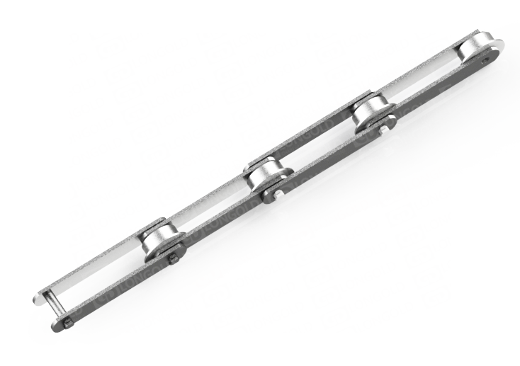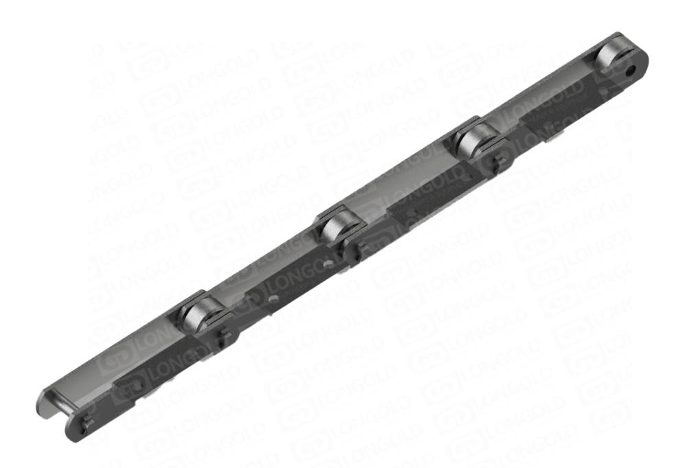 此種輸送鏈?zhǔn)怯呻p節(jié)距鏈條衍生而來(lái)的,鏈條節(jié)距為非常用規(guī)格,通過(guò)裝備特殊附件使鏈條滿足特定的工作需求