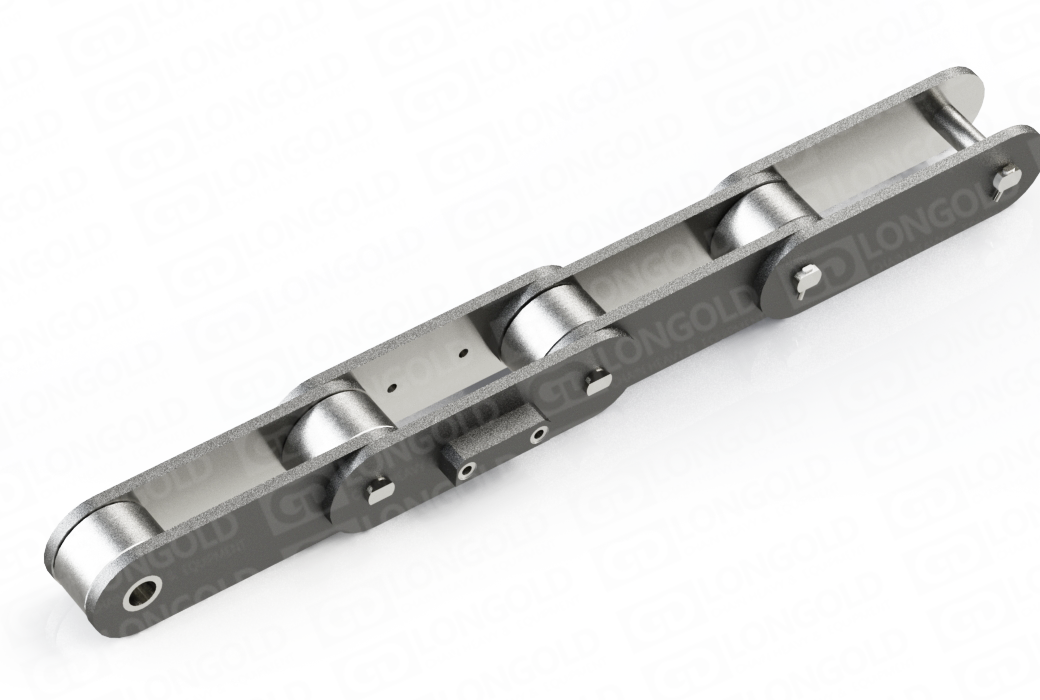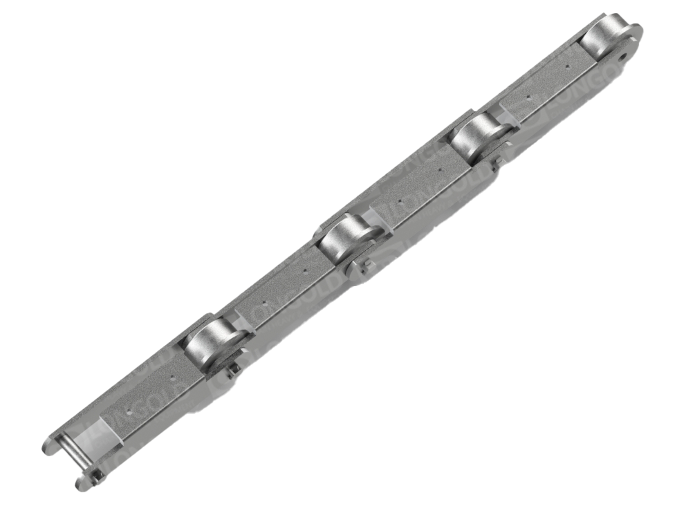 此種輸送鏈?zhǔn)怯呻p節(jié)距鏈條衍生而來(lái)的,鏈條節(jié)距為非常用規(guī)格,通過(guò)裝備特殊附件使鏈條滿足特定的工作需求。