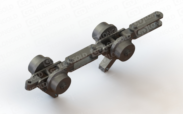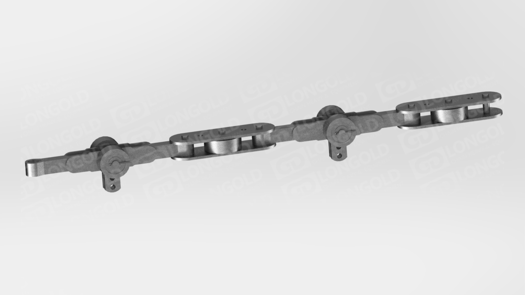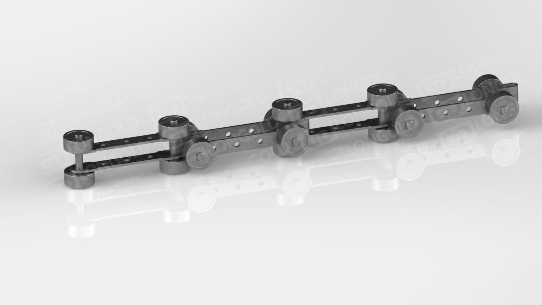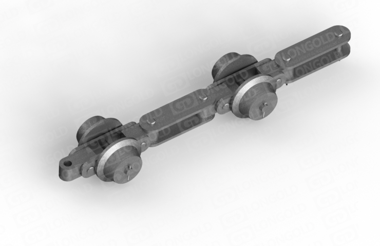 雙鉸接輸送鏈條設計用于能夠在空間范圍內(nèi)沿彎曲封閉軌道平穩(wěn)運行的輸送系統(tǒng),常見于輕型封閉軌懸掛輸送機。它的結(jié)構(gòu)允許在多個方向上靈活移動,適用于復雜的輸送路線。