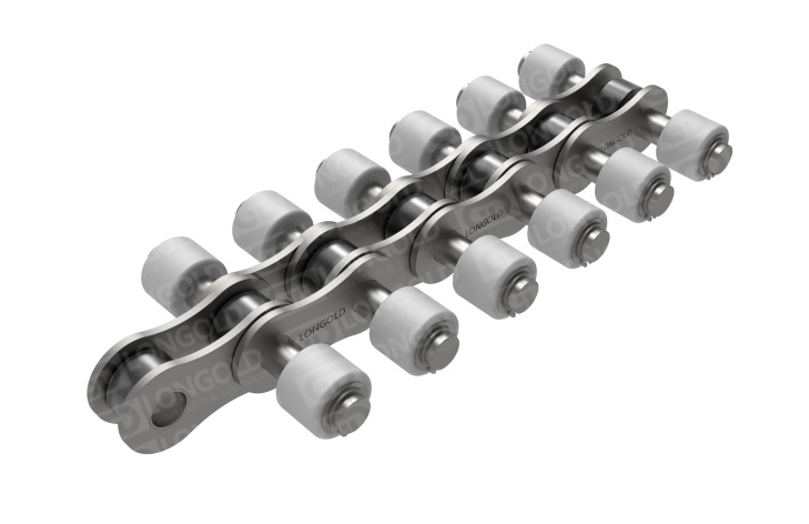 支盒機支盒成品輸送鏈是一種特殊設計的輸送鏈條,它在鏈條的兩側都裝有塑料滾輪,這些滾輪可以減少摩擦,提高輸送效率,并且降低噪音。