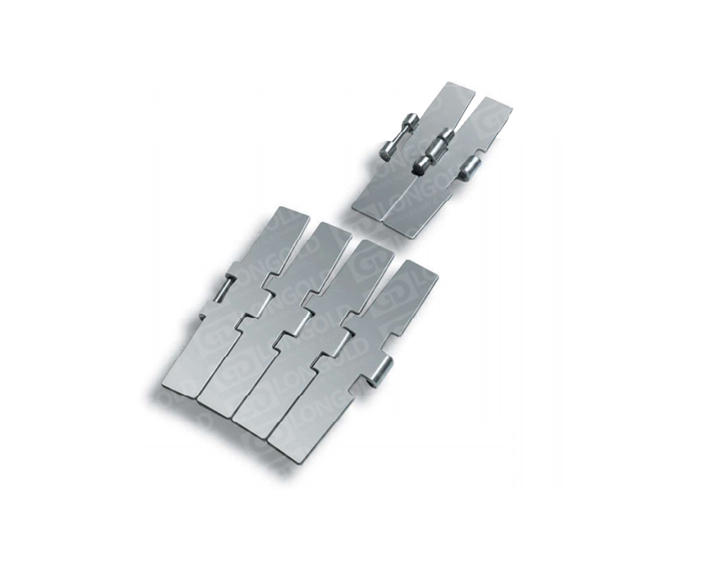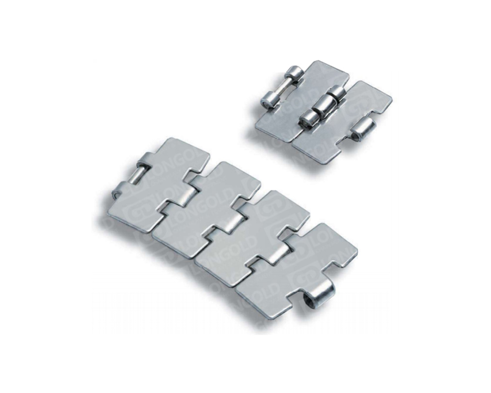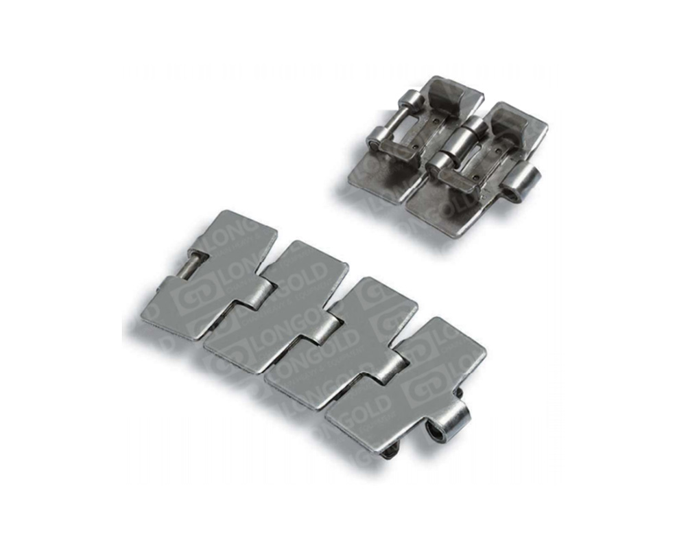 881T系列側(cè)彎鏈,鉸鏈為勾腳型(帶突舌),型號(hào)表示中用字母“T”表示。鏈片材質(zhì)為碳鋼時(shí),銷(xiāo)軸材料為表面硬化鋼;鏈片材質(zhì)為不銹鋼時(shí),銷(xiāo)軸材料為奧氏體不銹鋼。